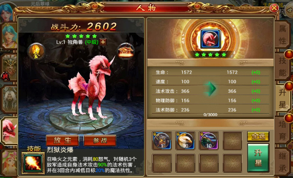 宠物技能数量由星级限制,升星需要消耗宠物精魄。