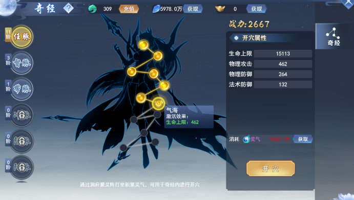 聚灵阵会随着时间来获得灵气值,灵气值可以用于打通经脉,从中获得属性。
