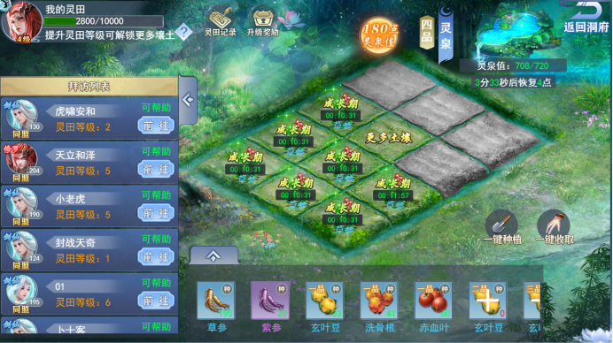 另外在游戏中每个修仙者都会有一个自己的洞府,洞府包括炼丹、聚灵、经脉、炼器、灵田等,其中灵田的等级越高所能够种植的草药就越多,草药在打BOSS中是会有些许掉落,玩家可以使用灵泉值来给种植的草药浇水,让它快速成长。