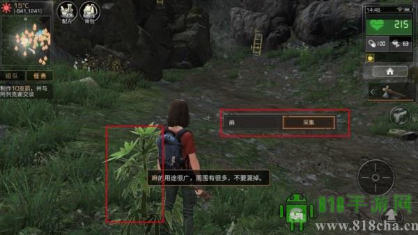 野外生存,野果或者一些植物资源是必不可少的。那么我们如何采集他们呢?首先我们在野外能看到一些可供采集的如:麻、野果等资源,靠近这些资源,我们可以看到采集的对话框。然后我们可以点采集来进行采集。