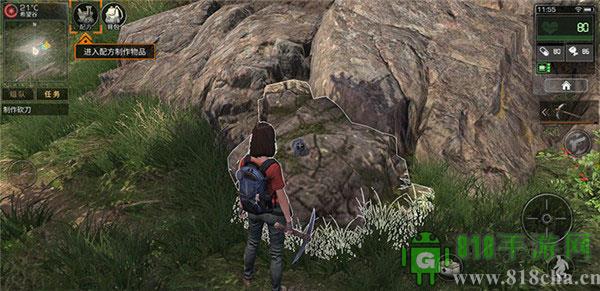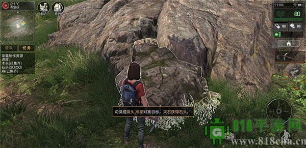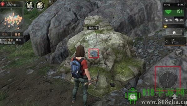 讲完移动的简单介绍,我们来说下如何获取资源!首先我们看到屏幕内是一个石头!我们换上挖石头需要的工具,然后看到屏幕中间有一个十字架,那是个准心,我们把准心瞄准需要开采的石头,然后点击右边的原型按钮,这时候我们就可以进行采集资源啦!