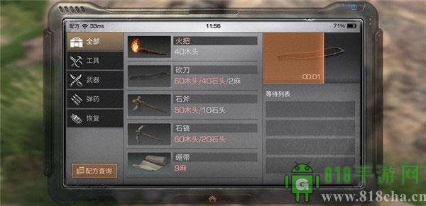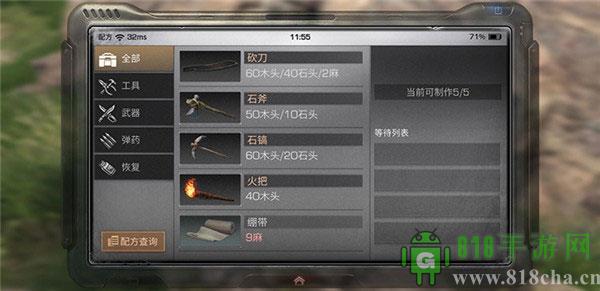 斧头、搞头、火把及绷带等按配方开采都所需资源后就可以直接进行打造,下面小版以新手教程的砍刀为例为大家做个简单展示: