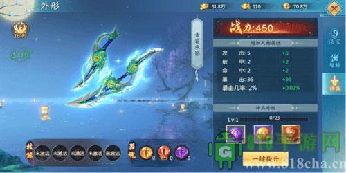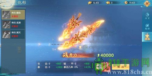海量暴击属性;激活神兵外形可以按百分比提升暴击属性,并获得专有的外形显示。