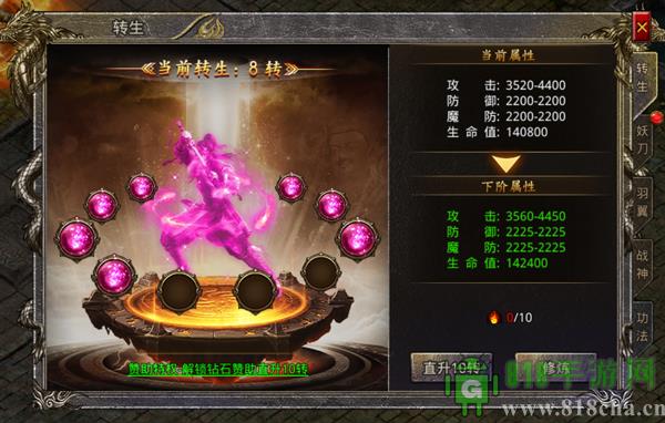 转生可增加角色攻击、防御、魔防、生命值等基础属性,在碰到无法碾压的怪物时,记得来升级下转生系统喔!转生升级需要消耗元宝或灵符,购买相应的材料即可享受加速升级。