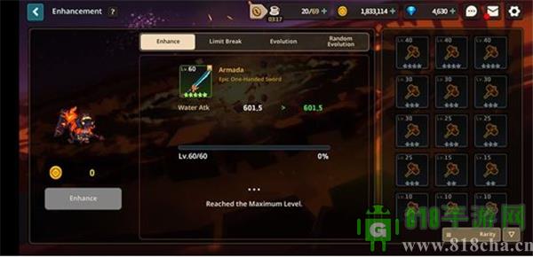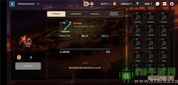 3、等级突破,需要有相同的武器作为消耗品才能进行,突破5次以后可达上限65级,建议大家可以一次收集6把相同武器,然后花金币全部升到5星,然后选一把最好的,剩下五把就拿来最为突破的消耗品。
