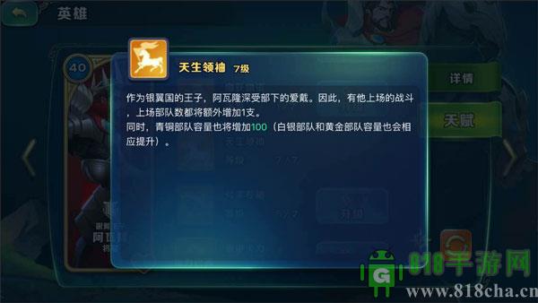 3、阿瓦隆,自带光环的骑士,能增加弓手的攻击力,“集中火力”打BOSS必备,最重要的是 “天生领袖”这个天赋,对于新手来说,这个天赋非常重要,能提高你上场部队的数量,以及提高你青铜部队、白银部队、黄金部队的容量,正所谓千金难买一人口,这个天赋一定要点,还有“缴纳物资”这个天赋,能在战斗后额外获取资源,在前期战力和体力有限的情况下,也是不错的选择,阿瓦隆看似辅助型英雄,但前中后期都有不同方向的高收益;